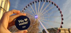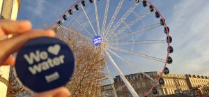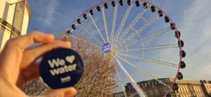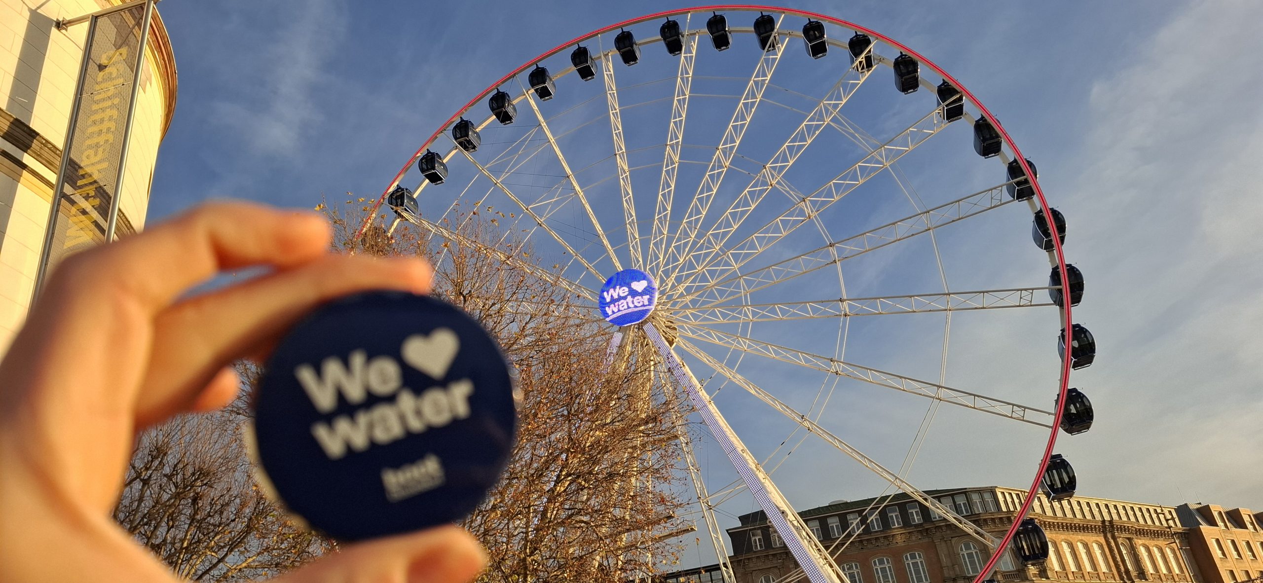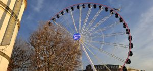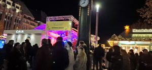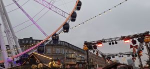 Lustig war die Werbung für die kommende Boot-Messe Januar in Düsseldorf. Diese sah aus wie die Metalldosen mit Pfefferminzbonbon, die man auf der Messe bekam und die ich zufälligerweise sogar in der Jacke dabei hatte. Ich habe versucht, mit der Dose und dem Riesenrad ein Foto zu machen. Wir gingen ungebremst durch diesen Minimarkt durch zum ersten richtigen Markt auf dem Rathausplatz.