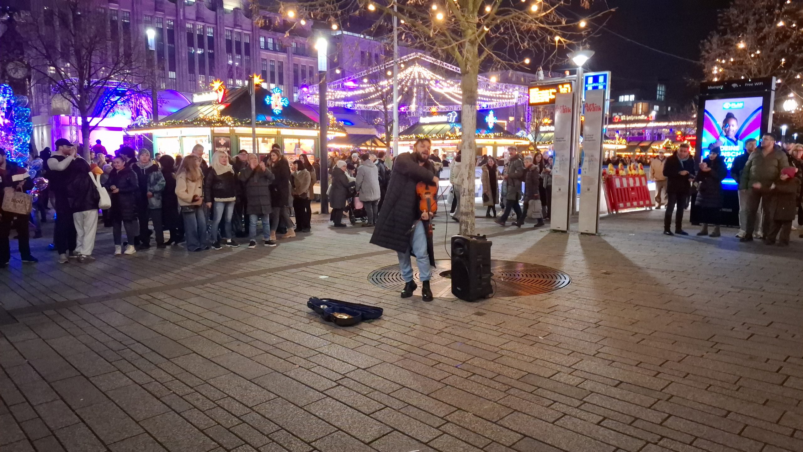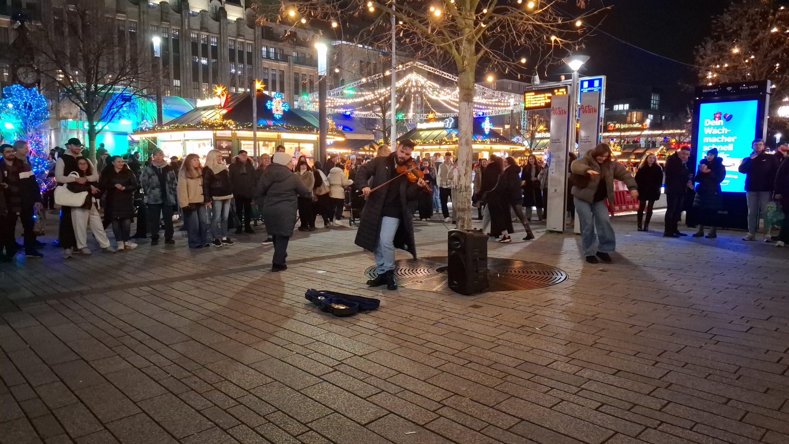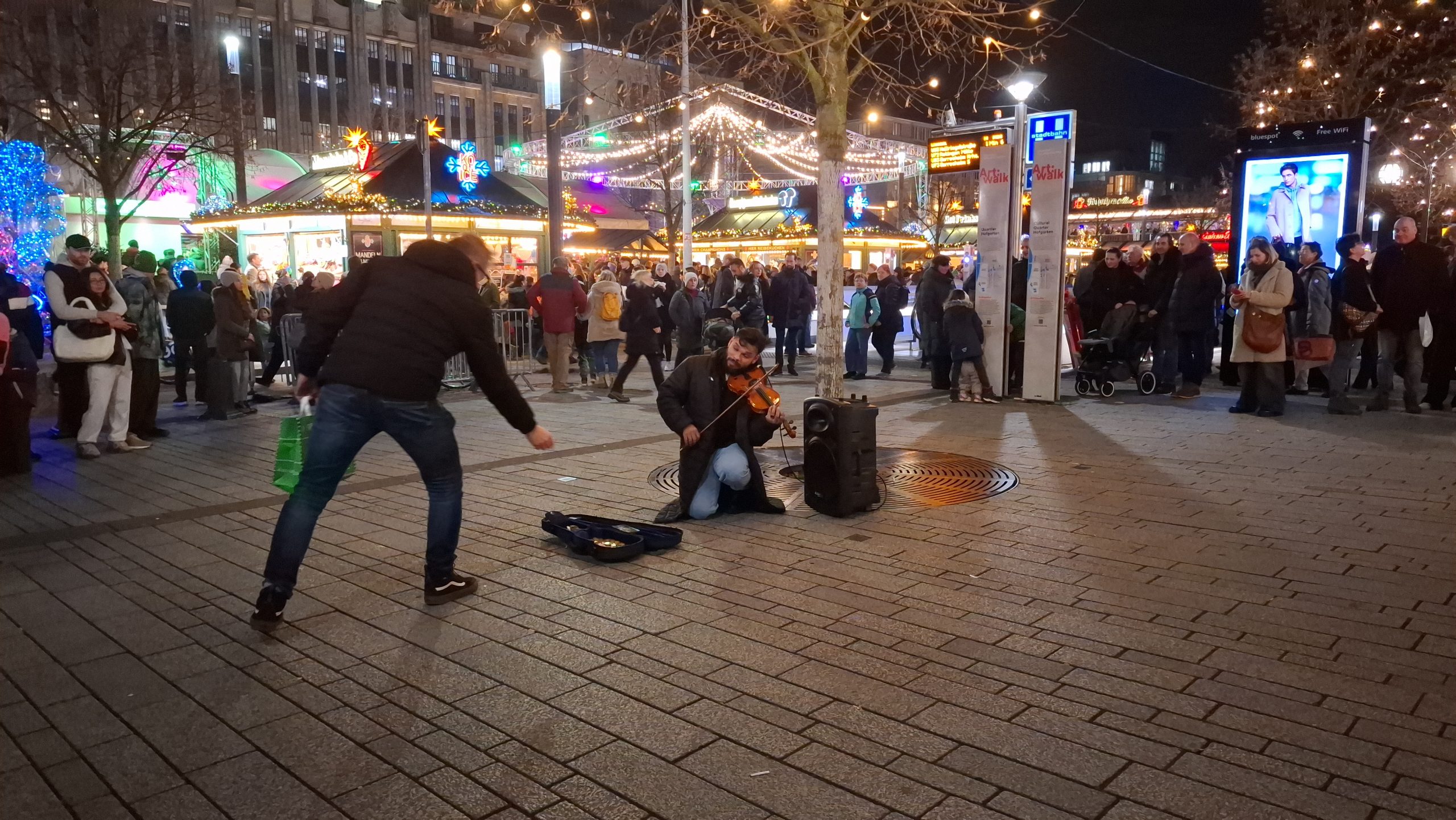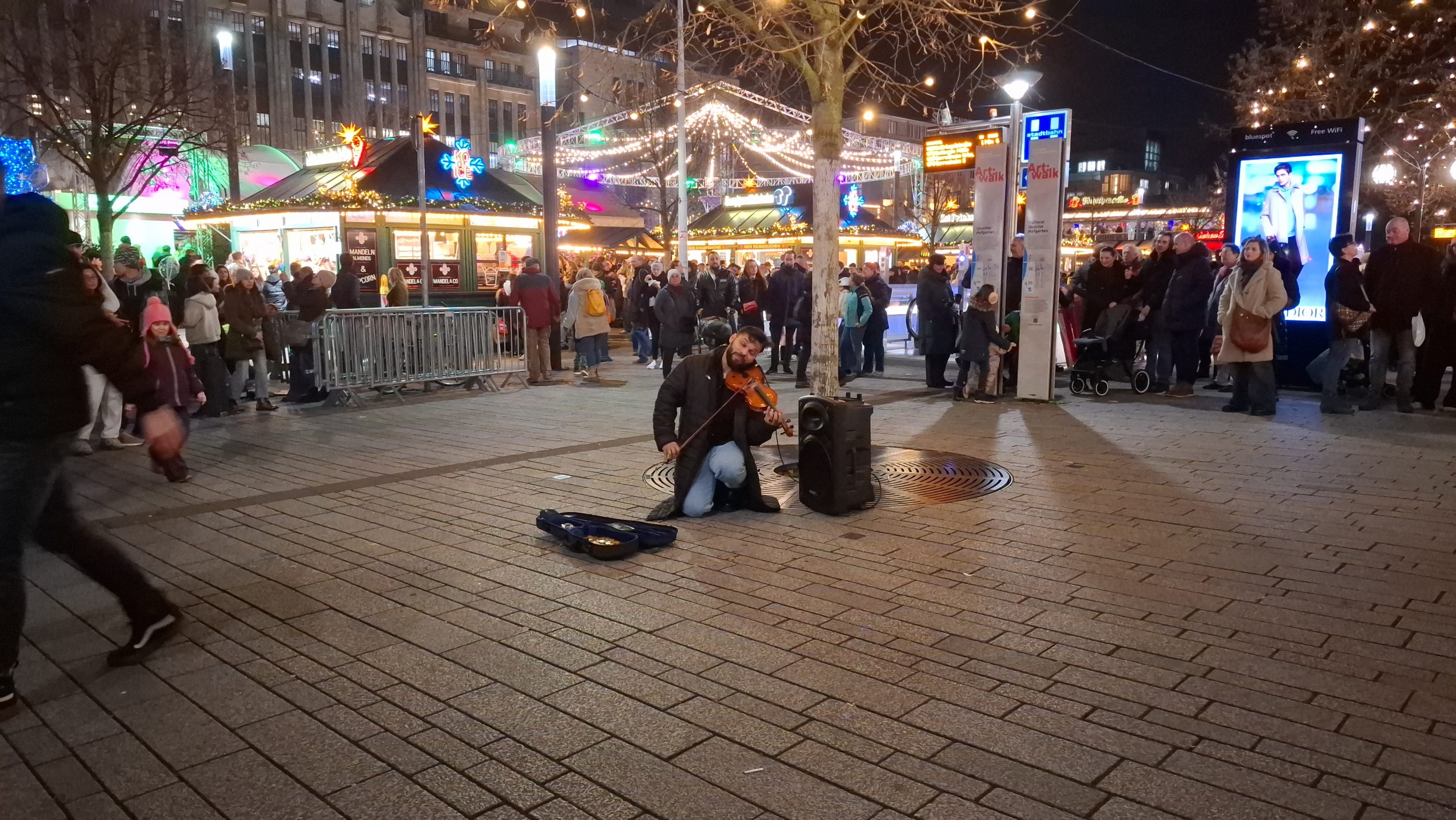 Es gab einen Markt, den wir letztes Mal nicht gesehen hatten, nahe dem Elektronikladen Coolblue. Zum Glück waren wir bei diesem, der war schon cool, denn am Glühweinstand gab es auf dem Dach etwas, was sehr viele Luftblasen in die Menge warf. Die Luftblasen hatten Nebel im Inneren, was das Platzenlassen ziemlich interessant machte. Lange blieben wir an der Stelle allerdings nicht. Es ging nochmals kurz nach Galeria, da Tani Durst hatte und wir was zu trinken holten. An der Straße spielte nahe Galeria ein Straßenmusiker Geige, der gut war und entsprechend eine große Zuhörerschaft anlockte.