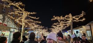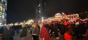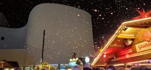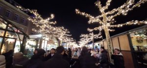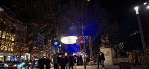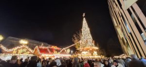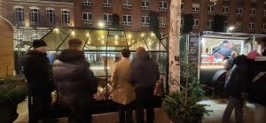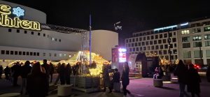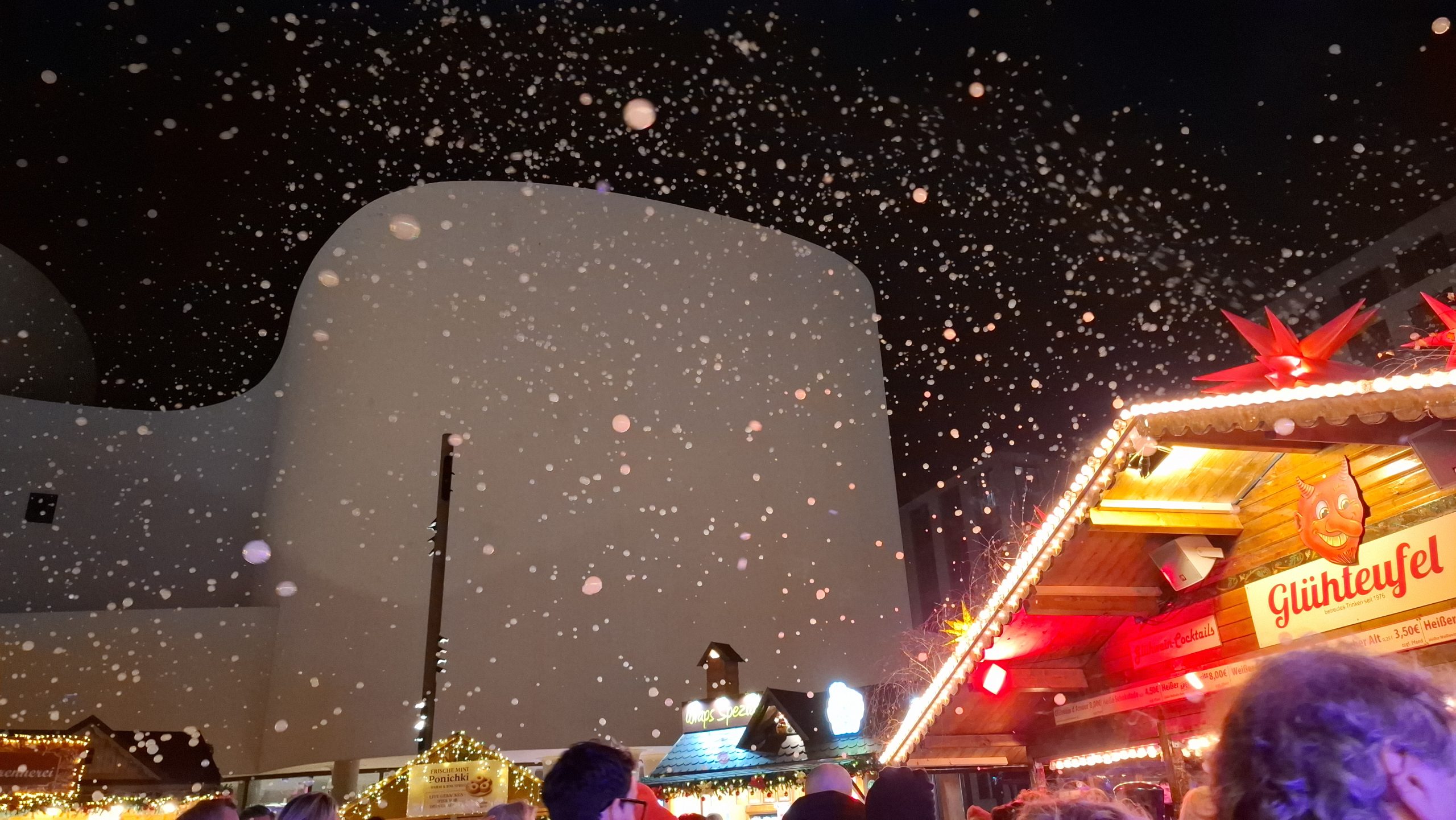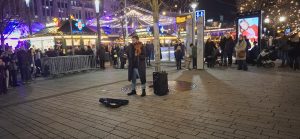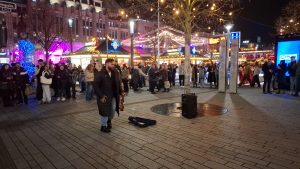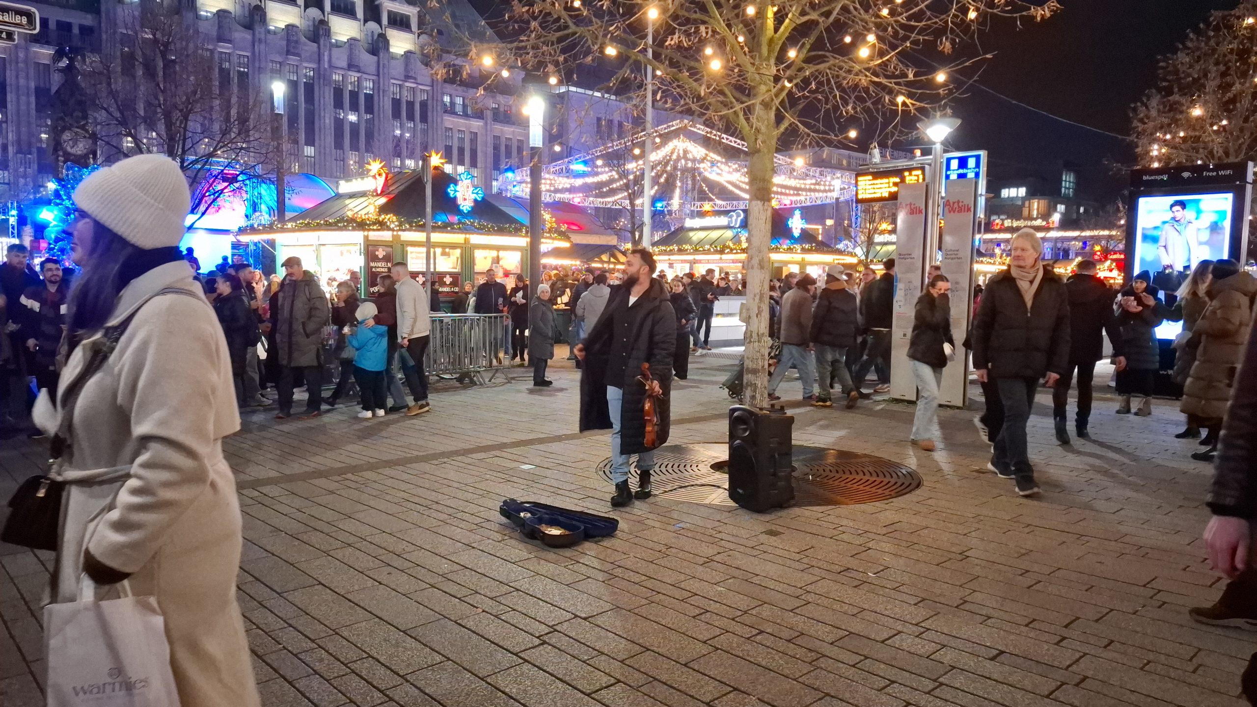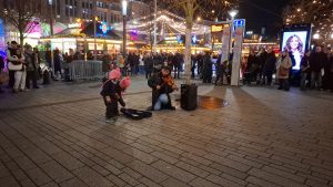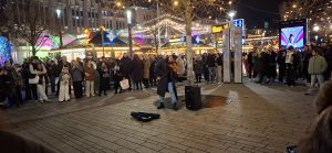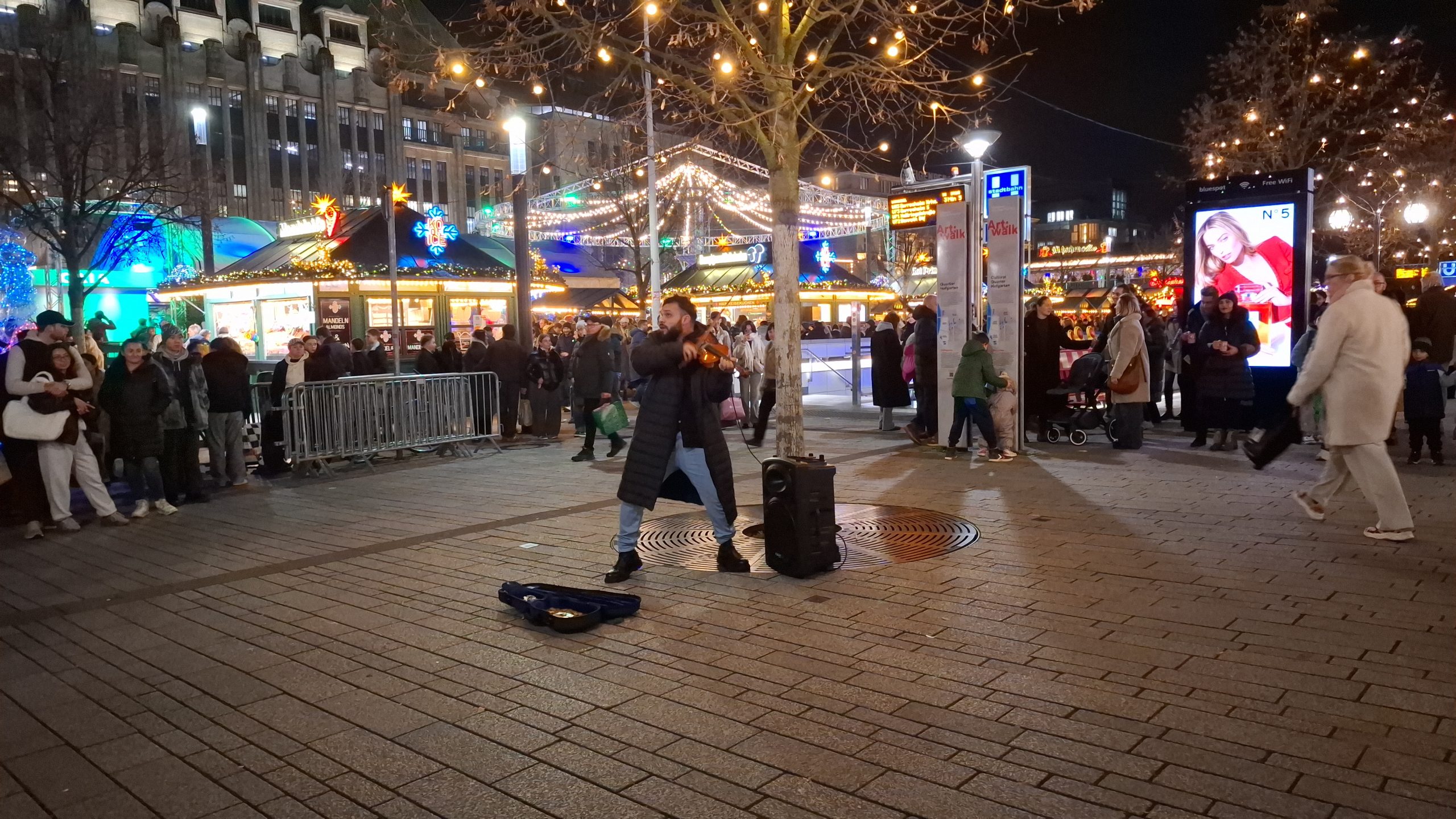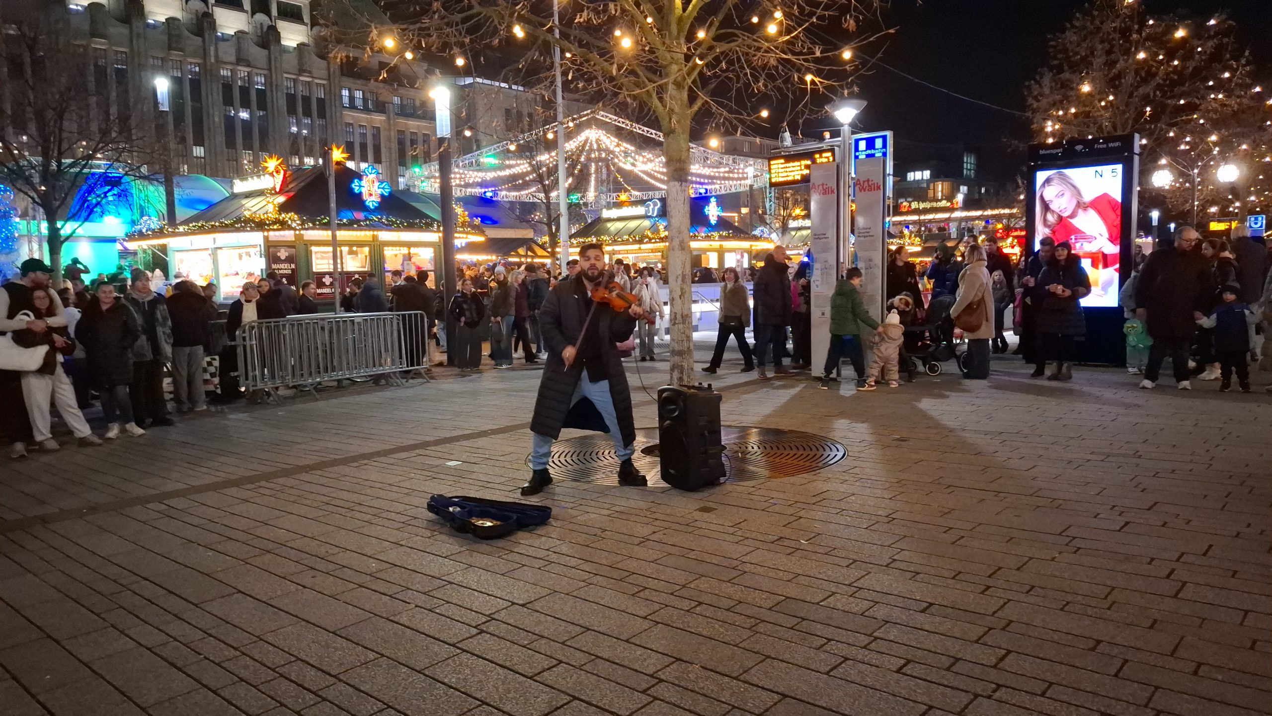 Es gab einen Markt, den wir letztes Mal nicht gesehen hatten, nahe dem Elektronikladen Coolblue. Zum Glück waren wir bei diesem, der war schon cool, denn am Glühweinstand gab es auf dem Dach etwas, was sehr viele Luftblasen in die Menge warf. Die Luftblasen hatten Nebel im Inneren, was das Platzenlassen ziemlich interessant machte. Lange blieben wir an der Stelle allerdings nicht. Es ging nochmals kurz nach Galeria, da Tani Durst hatte und wir was zu trinken holten. An der Straße spielte nahe Galeria ein Straßenmusiker Geige, der gut war und entsprechend eine große Zuhörerschaft anlockte.