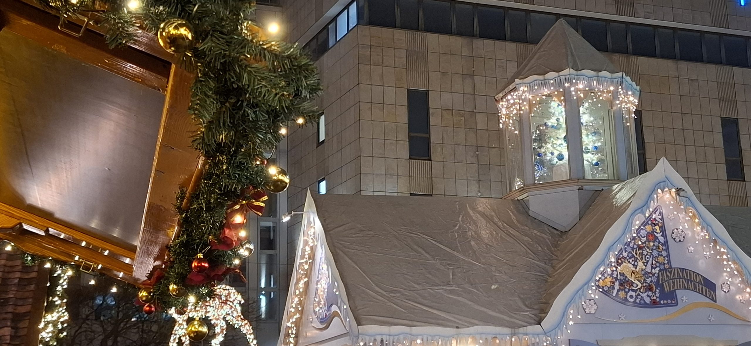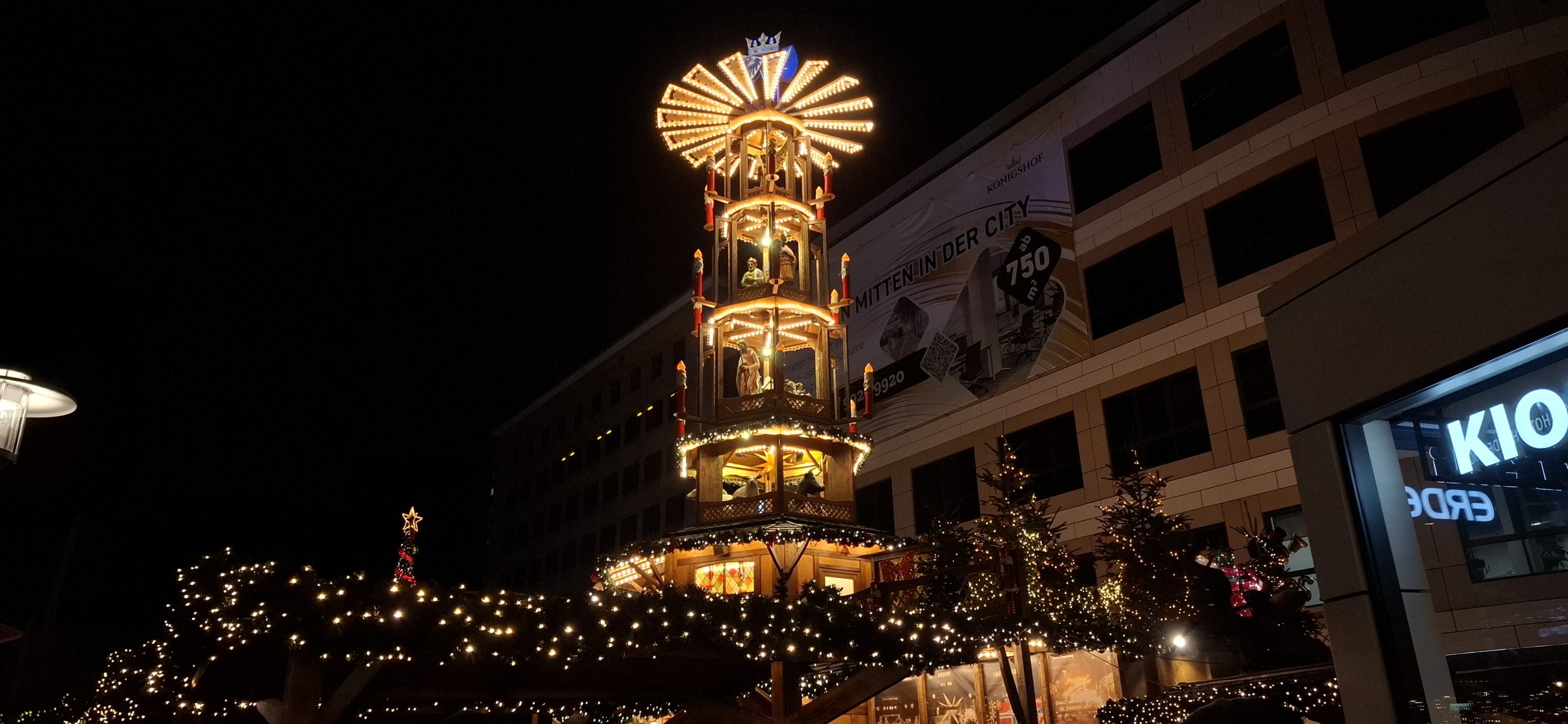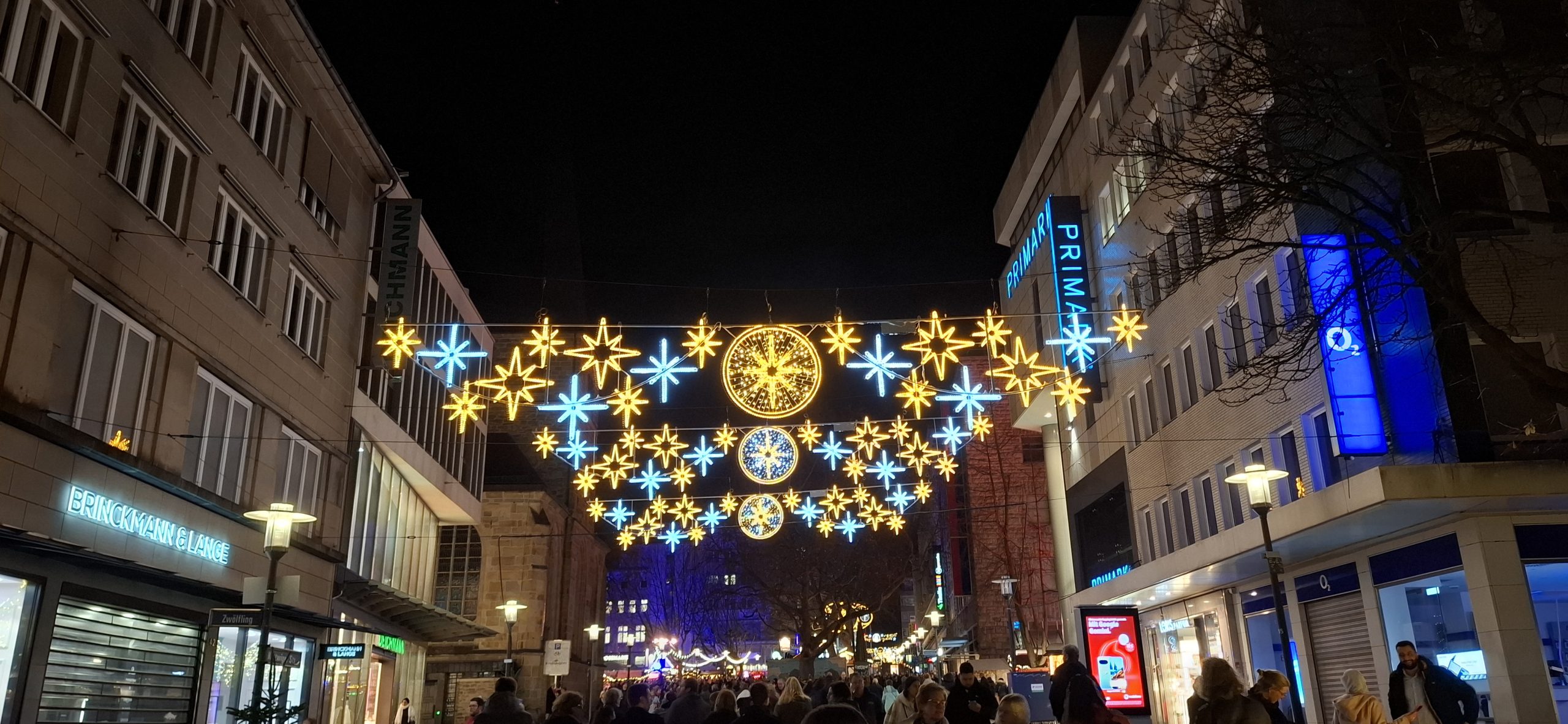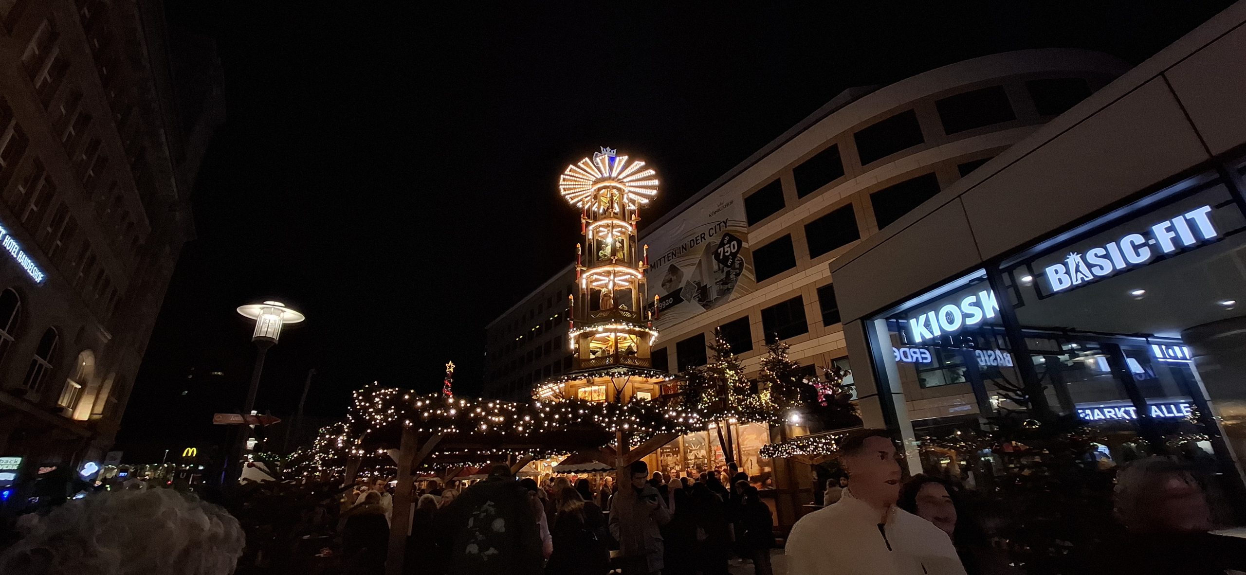Am Dienstag, dem 16. Dezember 2025, waren wir nach der Arbeit noch auf dem Weihnachtsmarkt in Essen. Dementsprechend früh machte ich Feierabend, um Tani abzuholen. Wieder fuhren wir mit dem Mercedes A 150 meines Großvaters, da mein BMW in der Werkstatt war. Am selbigen Tag habe ich übrigens telefonisch mitgeteilt bekommen, dass der Motor auseinander genommen wurde und die auf ein spezielles Werkzeug warten, was die für die Steuerzeiten brauchen. Die Werkstatt ist etwas mehr auf Diesel als auf Benziner ausgelegt. Ich holte also Tani ab und wir fuhren direkt durch nach Essen. Geparkt haben wir im Parkhaus gegenüber vom GOP in Essen, die Fahrt war wieder relativ flüssig. Von da gingen wir dann zum nur wenige Gehminuten entferntem Weihnachtsmarkt.