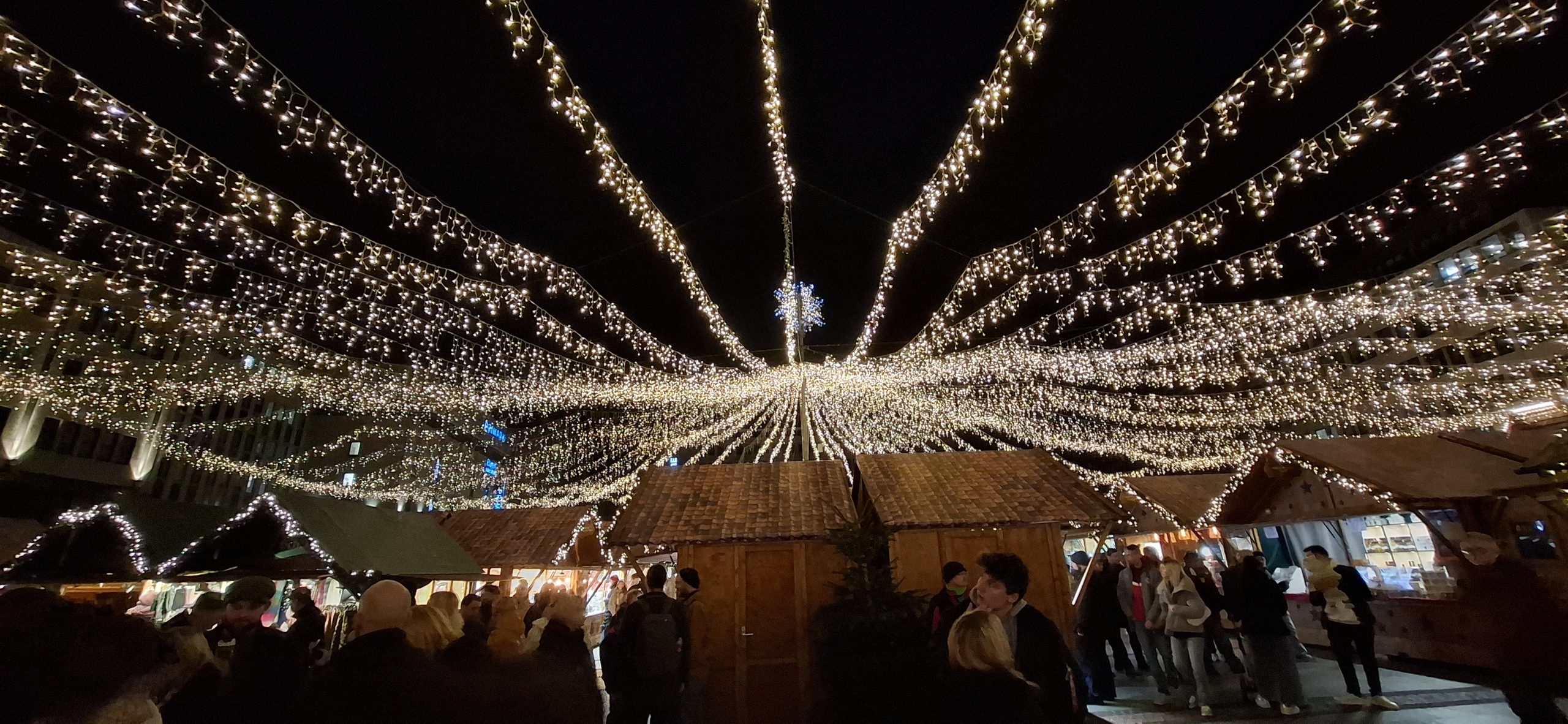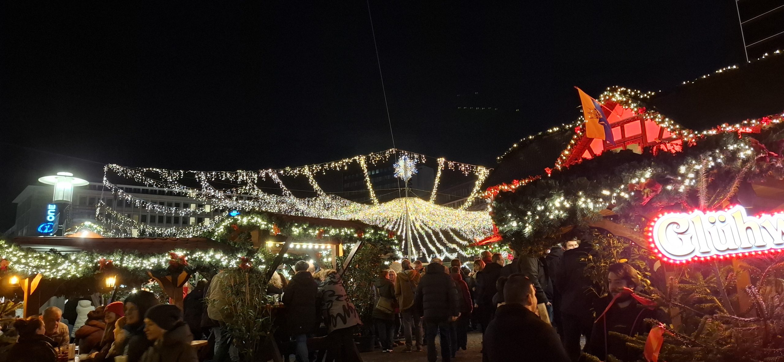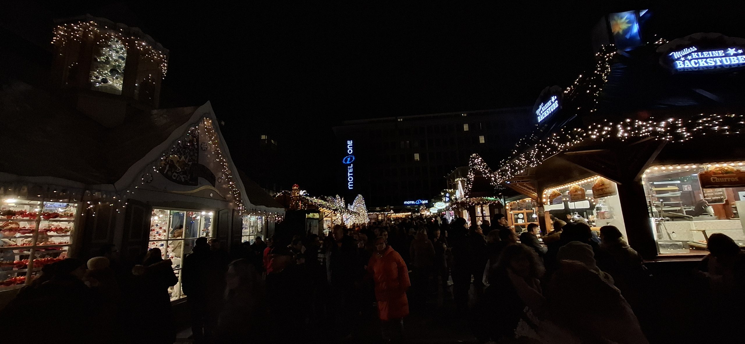 Wir gingen zuerst bis zum Ende Richtung Hauptbahnhof, von da dann zurück. Zwischendurch sahen wir noch ein Orchester, was in einem Seitenteil des Weihnachtsmarktes mit Blasinstrumente Weihnachtsmusik anstimmte. Auf dem großen Platz war wie jedes Jahr ein Lichtnetz von der Mitte aus über die Weihnachtsmarktstände gespannt. Der Langis-Stand war auch da, wo er jedes Jahr war.