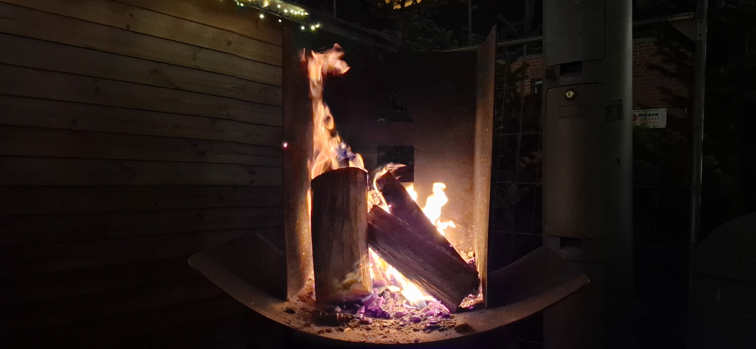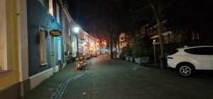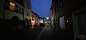 Da die Schlange zu der Zeit aber ungemein lang war, entschieden wir uns, zuerst zum Glühweinstand zu gehen. Wir holten je einen roten mit Amarettoschuss, also das Übliche. 4 € + 1 € für den Schuss und kein Pfand. Wir fanden einen Standplatz, an dem wir eine Laterne als Tisch missbrauchten. Tani hatte zwar den Flachmann mit Amaretto bei, aber da überall „Bitte keine selbst gebrachten Getränke und Speisen“ stand, wollte sie erstmal keinen eigenen Amaretto nutzen. Nach dem Glühwein gab es für Tani direkt noch einen zweiten, den ich holte, diesmal ohne Schuss. Wir haben nun mal den Flachmann genutzt und selbst den Amaretto reingehauen. Nach dem zweiten Glühwein gingen wir zum Rheindöner-Stand, dessen Schlange sich nun enorm verkleinert hatte.
