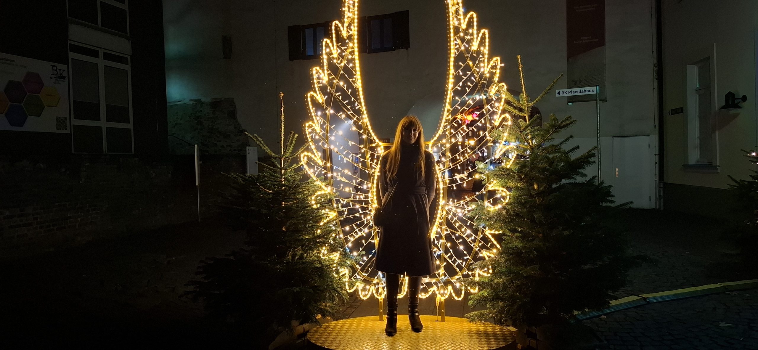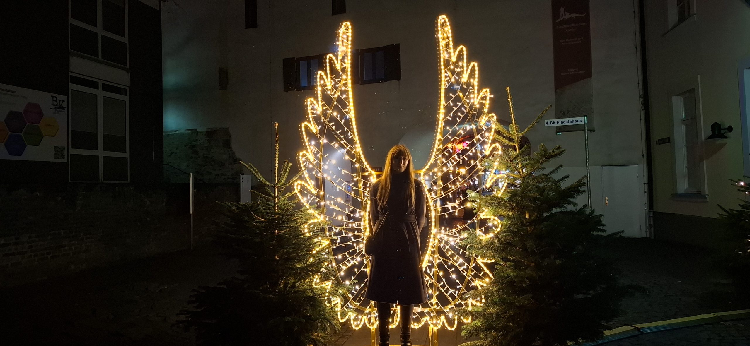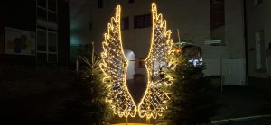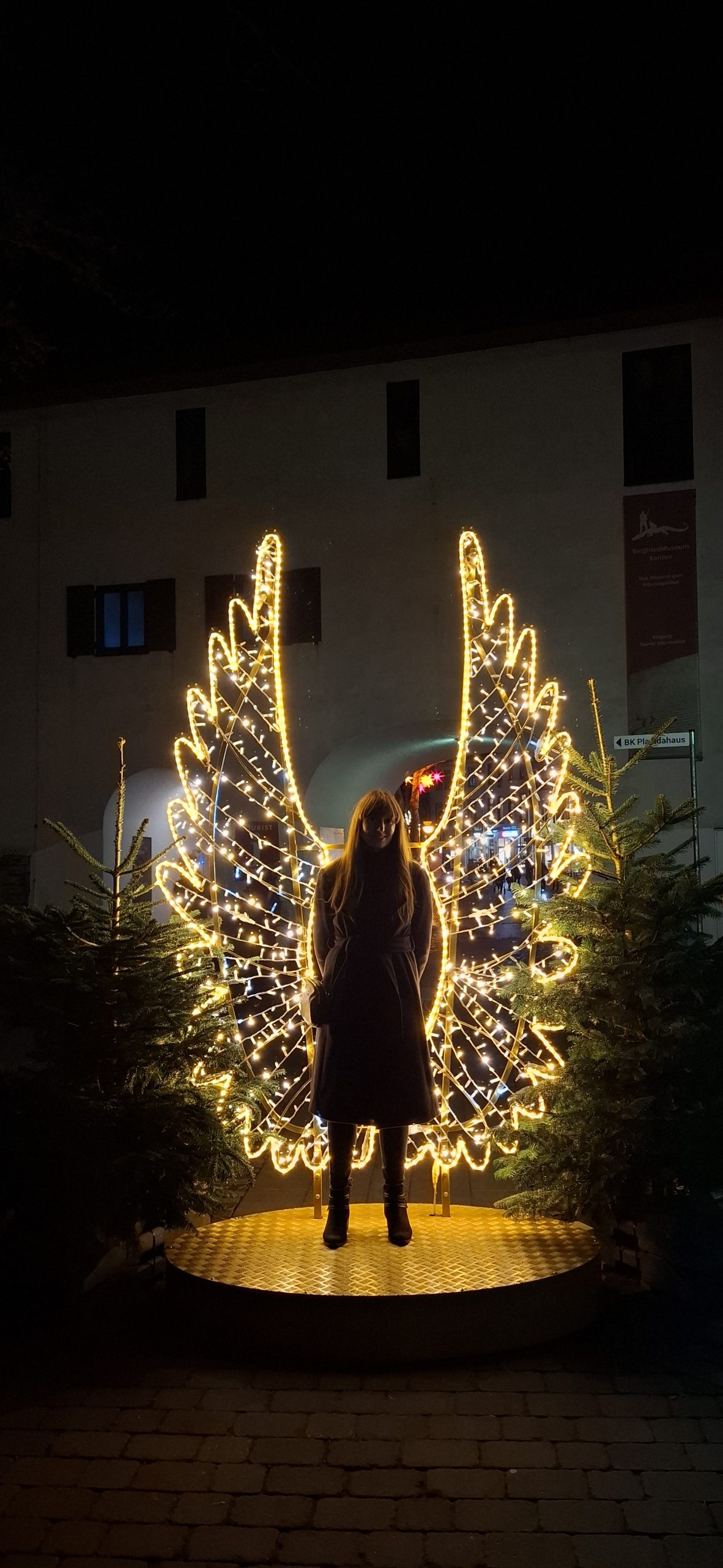 Danach holte ich Tani noch einen Glühwein ohne Schuss, den Schuss machte sie wieder selbst rein. Nach diesem Glühwein ging Tani für 50 Cent kurz auf Toilette. Danach gingen wir noch eine Runde um den Weihnachtsmarkt und im Anschluss zum Auto. Zwischendurch am Tor machte ich von Tani noch ein Foto, an leuchtenden Engelsflügel, wo man sich zwischen stellen konnte. Nach einer angenehmen Fahrt, zündeten wir natürlich daheim noch die dritte Adventskerze an und saßen beim Film „Santa Clause – Eine schöne Bescherung“ mit einem Glühwein noch ein wenig im Wohnzimmer, bevor es dann schon wieder zu Bett ging.