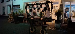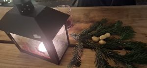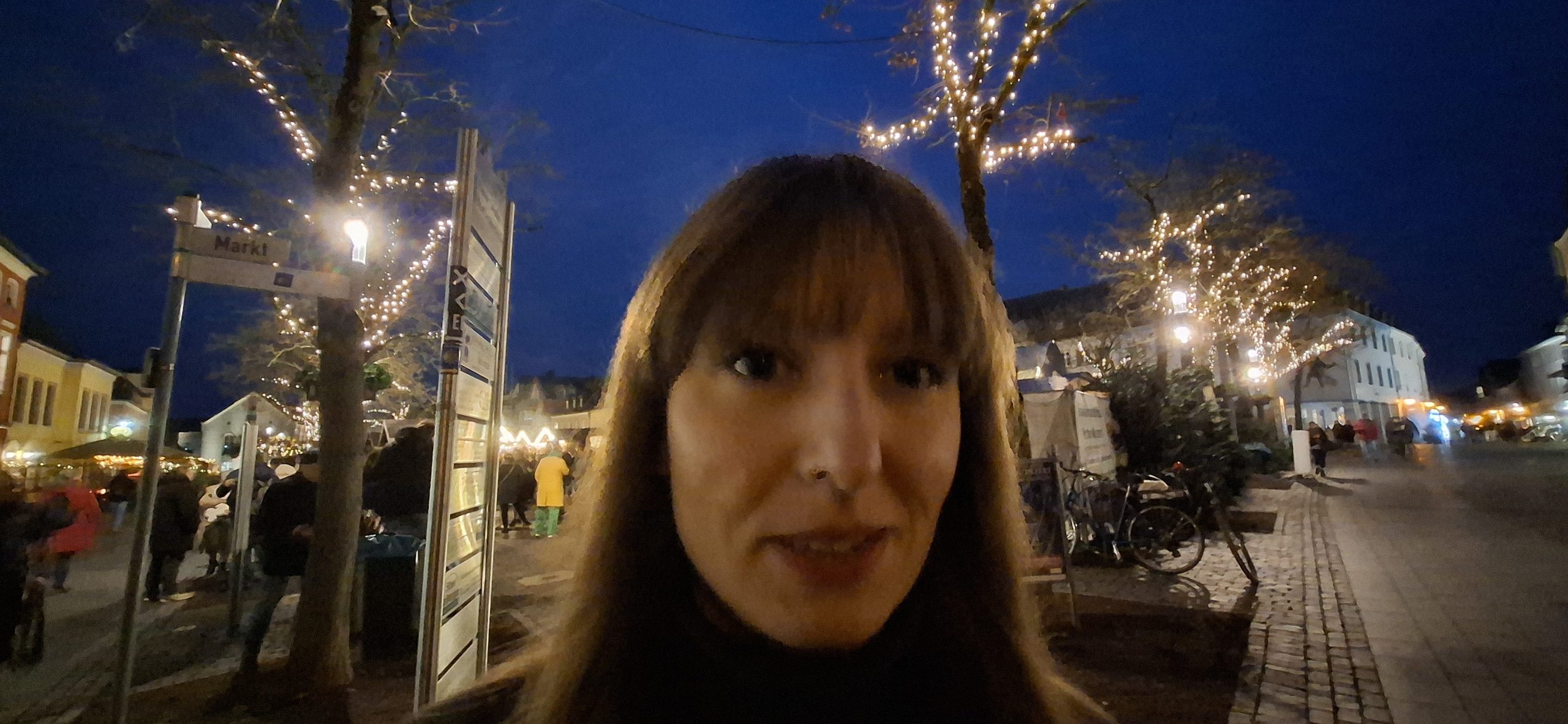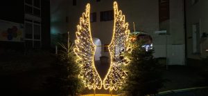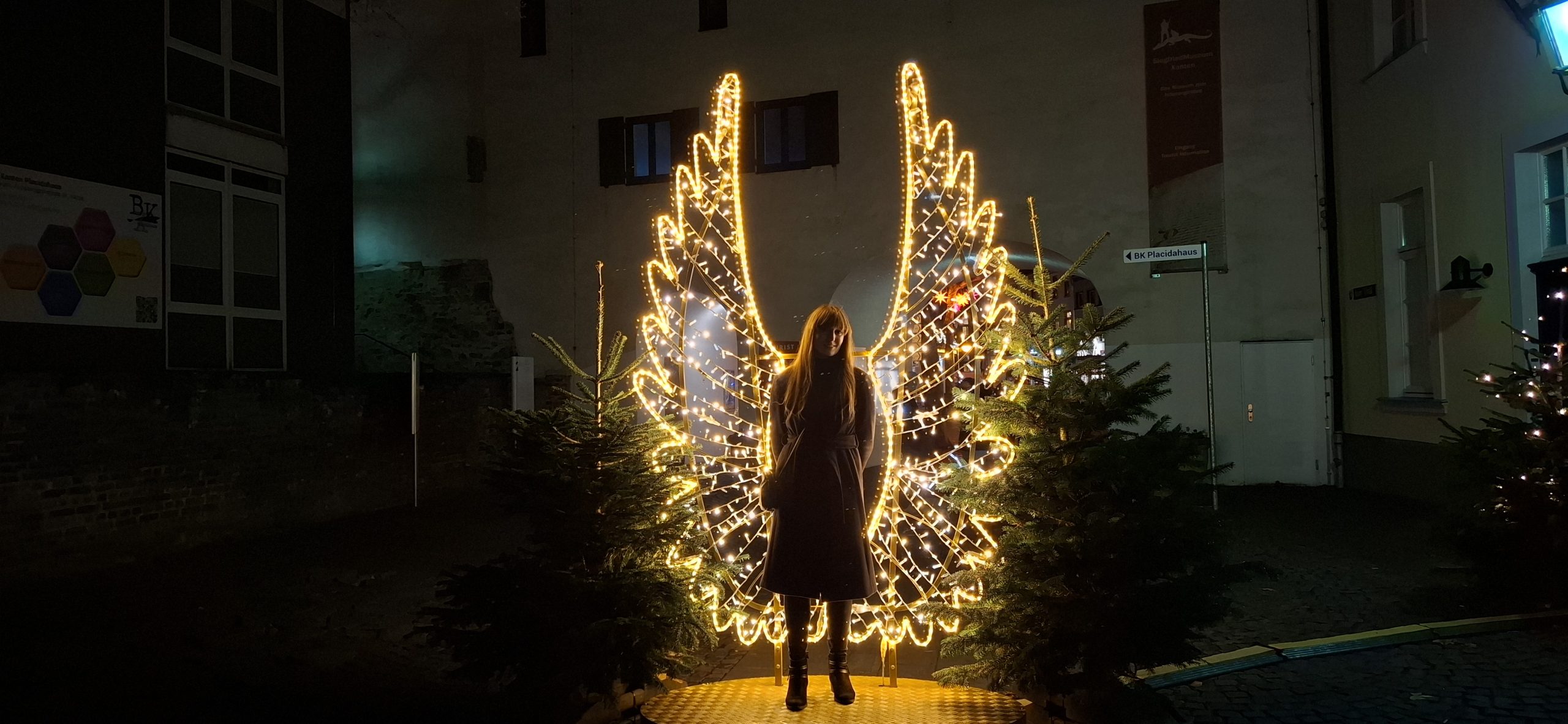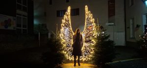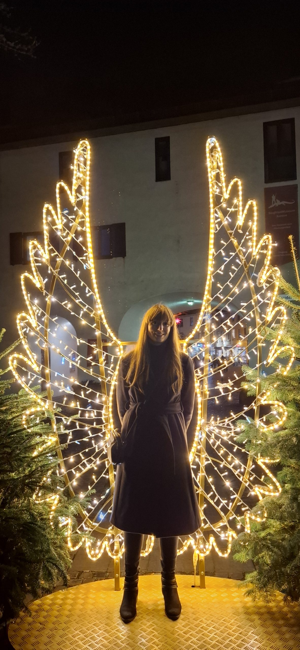 Danach holte ich Tani noch einen Glühwein ohne Schuss, den Schuss machte sie wieder selbst rein. Nach diesem Glühwein ging Tani für 50 Cent kurz auf Toilette. Danach gingen wir noch eine Runde um den Weihnachtsmarkt und im Anschluss zum Auto. Zwischendurch am Tor machte ich von Tani noch ein Foto, an leuchtenden Engelsflügel, wo man sich zwischen stellen konnte. Nach einer angenehmen Fahrt, zündeten wir natürlich daheim noch die dritte Adventskerze an und saßen beim Film „Santa Clause – Eine schöne Bescherung“ mit einem Glühwein noch ein wenig im Wohnzimmer, bevor es dann schon wieder zu Bett ging.