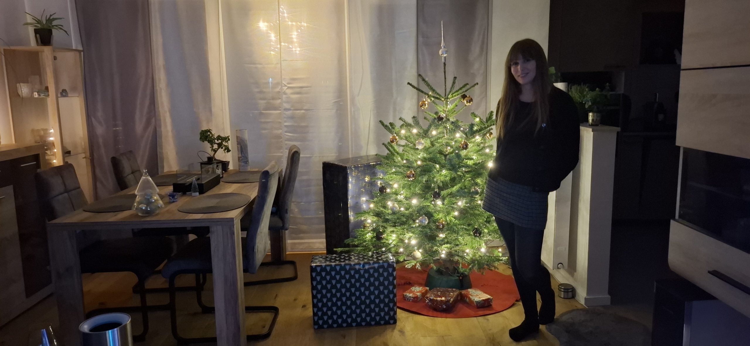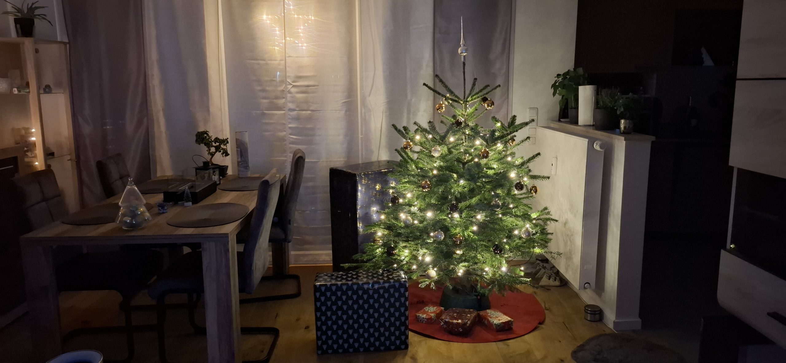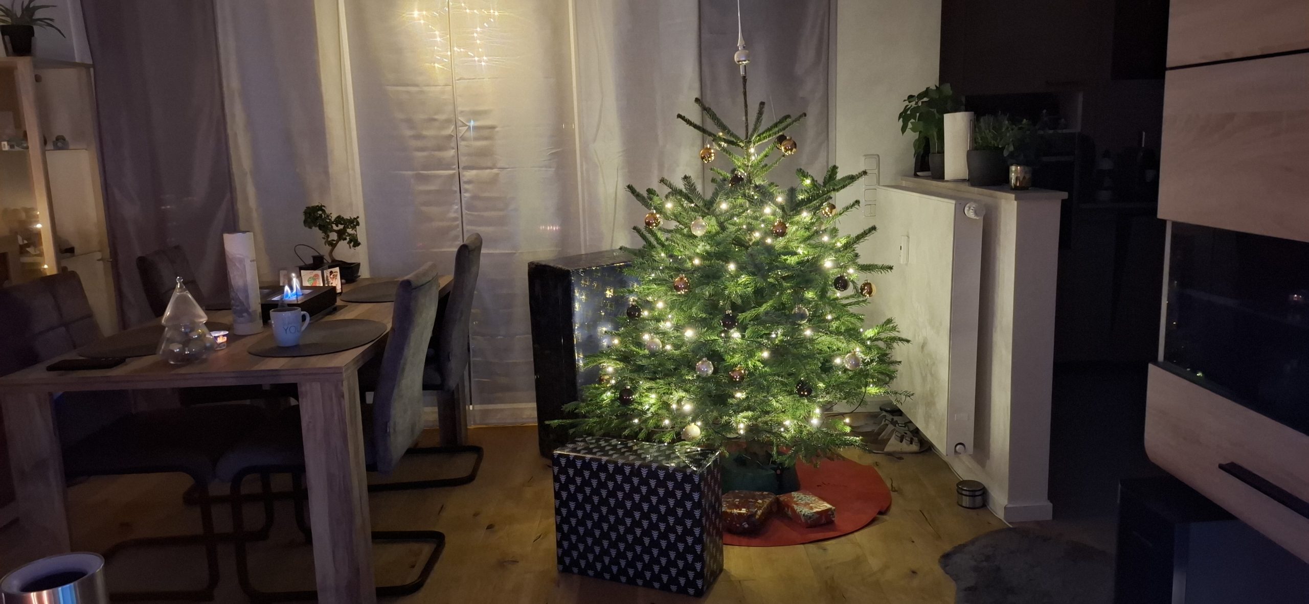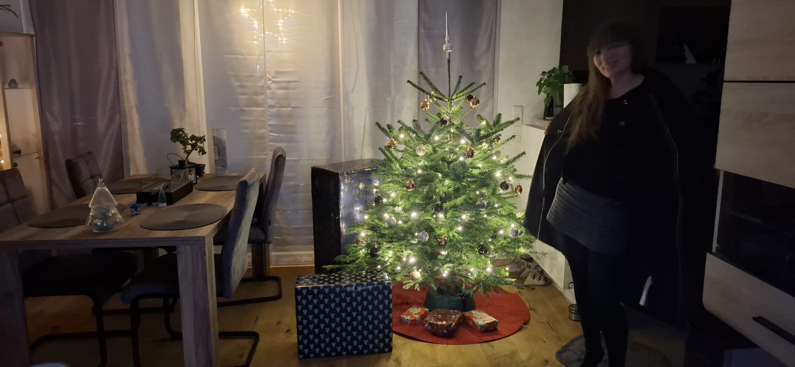 Am Weihnachten, Mittwoch, dem 24. Dezember 2025 hatten wir den typischen Ablauf. Zu Essen gab es den guten Lachs, den wir tags zuvor bei EDEKA an der Fischtheke gekauft haben, mit Nudeln und Soße. Danach ging Tani wieder zu Ihren Eltern, um mit denen in die Kirche zu gehen. Wärenddessen telefonierte ich erstmal mit meinen Eltern sowie Großeltern und machte mich dann auf, mit dem Mercedes meines Opas (da mein BMW ja noch in der Werkstatt war) das Geschenk für Tani von meiner Arbeit abholen. Das Problem: Es war diesmal ein großes Geschenk. Verpackt hatte ich es zum Glück bereits in Ruhe am vorletzten Arbeitstag, somit musste ich das Geschenk nur ins Auto packen und heim fahren. Es war ein Weinkühlschrank, sowie eine Tasche aus dem Beuringer Onlinestore. Vitaly feierte eine Weihnachtsparty im Keller auf der Arbeit, er hatte schlussendlich nicht mal bemerkt, dass ich im Gebäude war und die Pakete holte, obwohl ich mich ankündigte. Dabei war es nicht mal mehr eine Kleinigkeit. Die Tasche war nun nicht das Problem, allerdings war das andere Geschenk ein Weinkühlschrank. Ich habe alle Sitze im Mercedes umgeklappt und so gerade eben noch alles reinbekommen. An der Arbeit rief ich noch den Max an, wie es ihm so geht und einmal zum frohe Weihnachten wünschen. Seine Eltern waren bei ihm zu Besuch. Ich fuhr mal kurz vorbei, redete ein wenig mit den allen und war ca. eine viertel Stunde bei denen. Da konnte sich Max auch kurz die Rentnerschaukel, die ich zurzeit fahre, anschauen. Dass das Bremslicht defekt war, sah er natürlich direkt. Die hatten übrigens den Kamin angehabt, ein schönes Feuer, auch wenn er unter anderem die ungeeigneten Pressholzscheitel für geschlossene Kamine verwendete. Danach fuhr ich wieder heim, wollte schließlich vor Tani daheim sein. Dann musste ich noch das große Geschenk das Treppenhaus hochtragen und stellte es hinter dem Weihnachtsbaum. Den Karton mit der Tasche stellte ich vor dem Baum. Als Tani dann irgendwann nach Hause kam und den Karton der Tasche sah, fragte sie schon, was das für ein großes Geschenk sei und ich antwortete, dass ich ein kleines für sie versteckt hatte. Ca. eine Minute später sah sie auch den ganz großen Karton. Dann gings zur Bescherung. Zuerst sollte ich ein Geschenk öffnen, dass, von dem ich natürlich wusste, dass es Gürtel und Unterhosen waren, die wir schließlich vor kurzen zusammen bei Galeria kauften. Tanis erstes Geschenk konnte sie auch erahnen, da es relativ abgesprochen war. Dann kam das zweite Geschenk von Tani an mich. Ich schrieb vorab auf mein Handy auf, was ich vermute, was es ist. Es war ein kleiner Karton. Ich schrieb „JBL Kopfhörer“ und damit behielt ich Recht. Das Gleiche übrigens andersherum, Tani schrieb auf, was sie meint, was in dem ganz großen Karton ist und da sie „Weinschrank“ schrieb, behielt auch sie recht damit. Den Rest des Abends haben wir dann gemütlich mit Fernsehe ausklingen lassen.